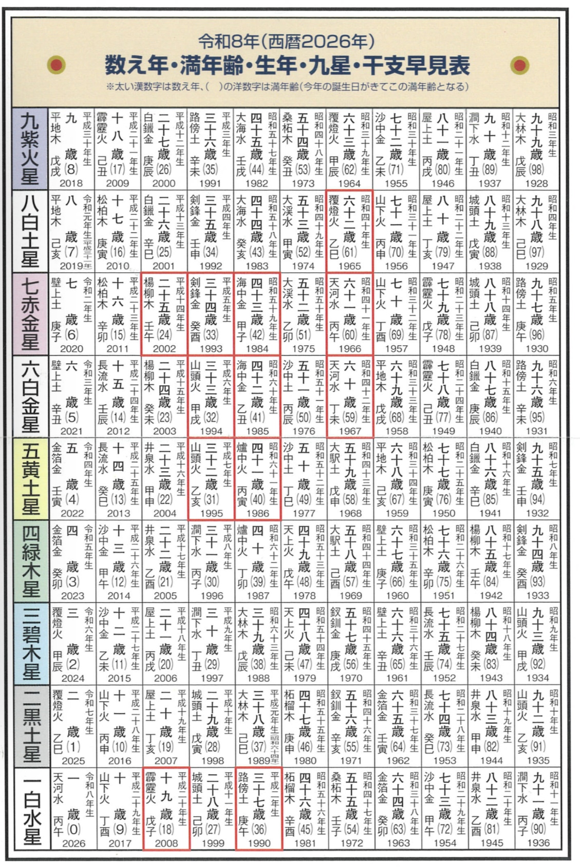 ※令和8年(西暦2026年)の早見表